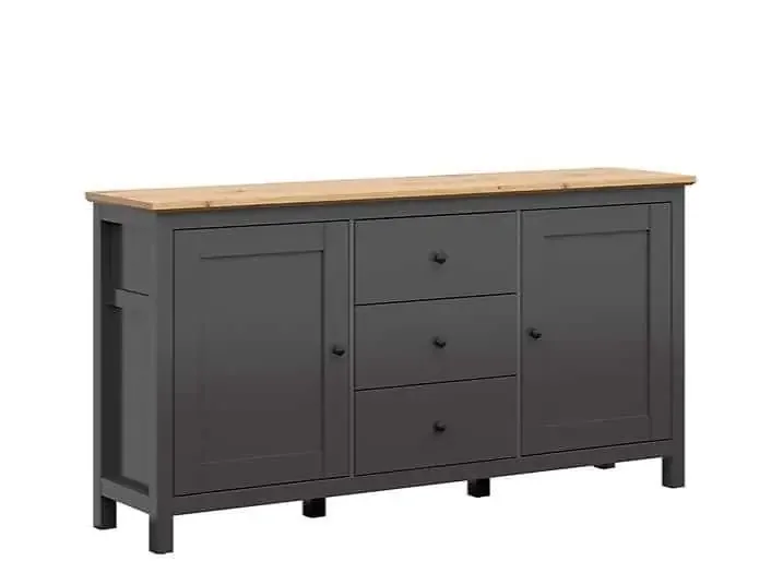 Uvnitř najdete zásuvky s tichým dojezdem a police za dveřmi. Vnější vzhled doplňují tmavé kovové úchyty ve tvaru knoflíků a rám z lamina v kombinaci barev grafit/dub artisan. Lamino grafit/dub artisan zaručuje snadnou údržbu a dlouhou životnost. Tuto komodu doporučujeme doplnit o další prvky série Hesen, abyste vytvořili jednotný a funkční interiér. Dodáváme v demontu s návodem na montáž, takže montáž zvládne každý. Vhodná do jídelny, ložnice i obývacího pokoje, kde zaujme svým nadčasovým designem a praktičností.