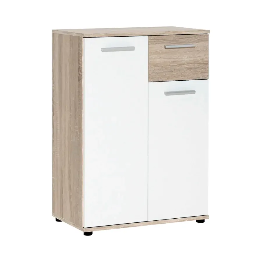 Základem je kvalitní lamino, které v kombinaci dubu sonoma a bílé barvy dodává moderní vzhled interiéru. Konstrukce nabízí jednu zásuvku s kovovými pojezdy a za dveřmi se nacházejí dvě variabilní police, které lze upravit podle potřeby. Zboží je dodáváno v demontovaném stavu, což usnadňuje dopravu a montáž. Díky neutrálnímu barevnému provedení se tato komoda hodí do různých prostor a snadno ji sladíte s dalším nábytkem. Povrch je odolný a snadný na údržbu, což zajišťuje dlouhodobou funkčnost a spokojenost uživatele.