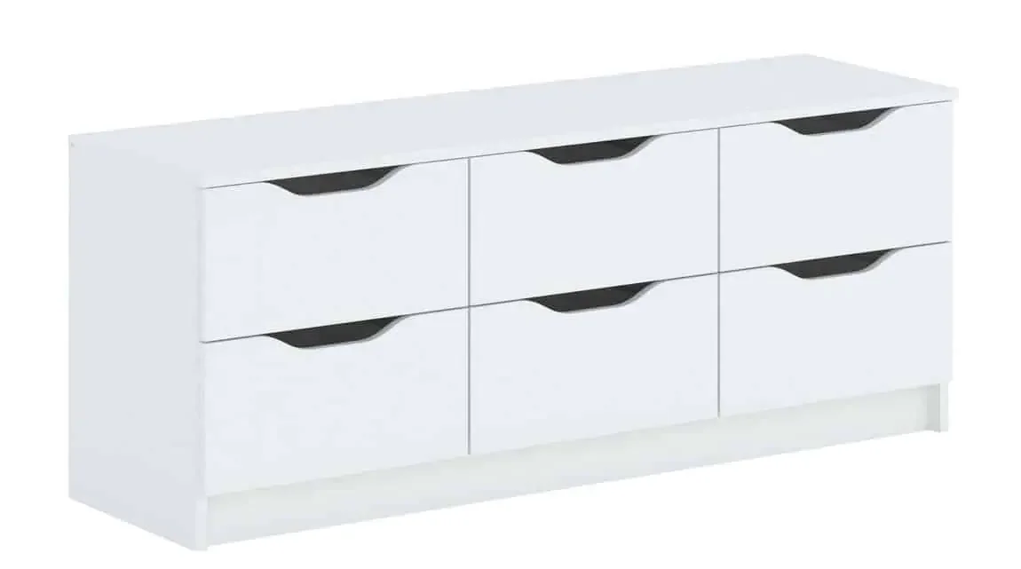 Komoda Kalista 6S nabízí šest zásuvek a čisté bezúchytkové otevírání, které dodává nábytku moderní vzhled. Její matná bílá povrchová úprava působí svěže a hodí se do různých interiérů.