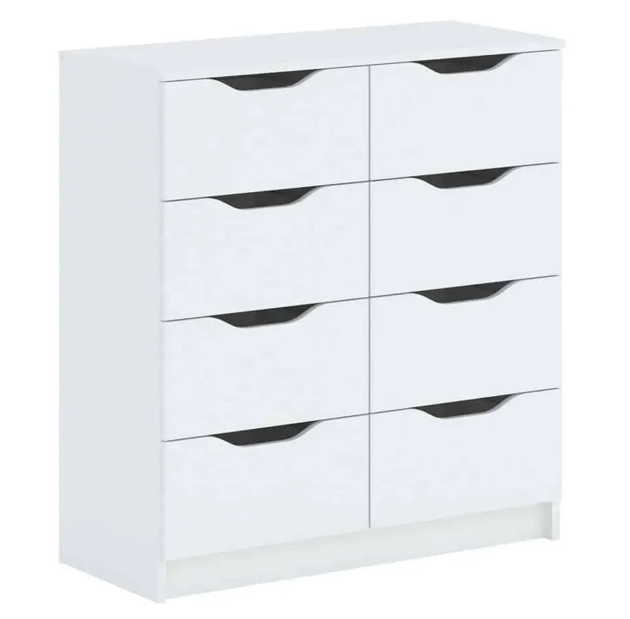 Elegantní komoda s 8 zásuvkami nabízí moderní vzhled a spolehlivý úložný prostor. Vyfrézované úchyty dodávají celku nadčasový detail. Korpus i dvířka jsou vyrobené z LTD desky s ABS páskou 0,45 mm v barvě matná bílá, která je odolná vůči teplotám a poškrábání. Lamino zajišťuje dlouhou životnost a snadnou údržbu. Dodáváme v demontovaném stavu pro snadnou přepravu a montáž. Tip: pro další praktické řešení úložného prostoru pro domácnost prohlédněte si naši nabídku polic, které dokonale doplní váš interiér.