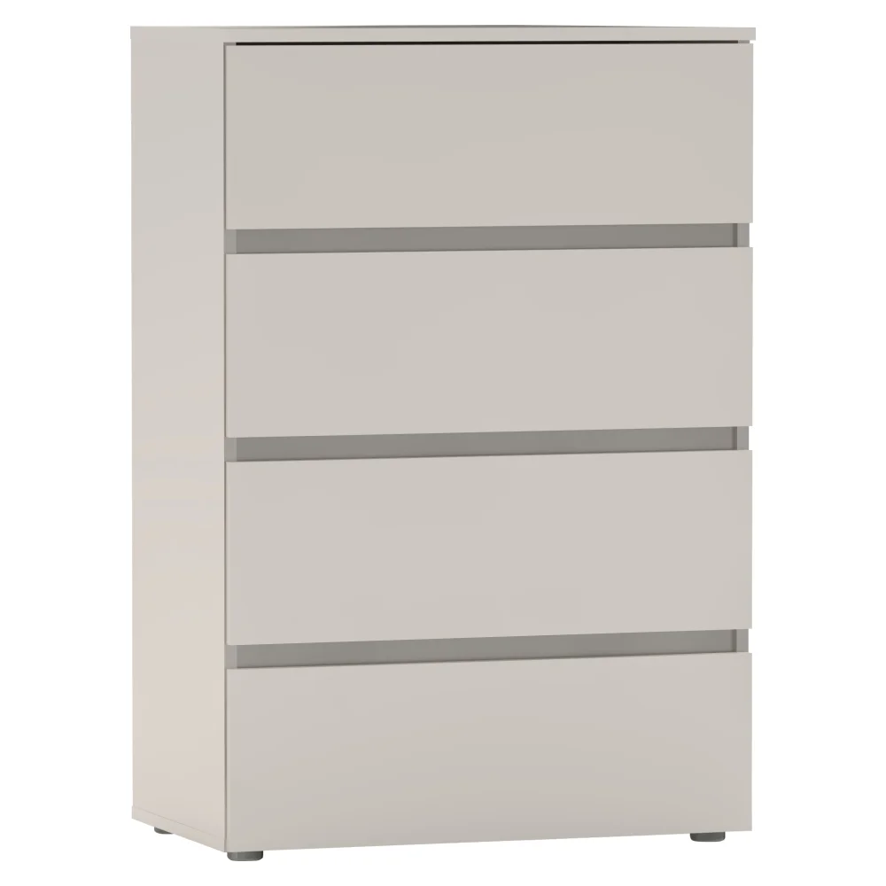 Stylová komoda ve svěží kašmírné barvě je vyrobena z laminované DTD o tloušťce 1,6 cm a nabízí čtyři prostorné zásuvky. Rozměry: 68,6 cm šířky, 40 cm hloubky a 101,5 cm výšky; vnitřní rozměry zásuvky 59,4 x 33,3 x 12 cm a nosnost každé zásuvky 5 kg, vrchní deska unese 10 kg.