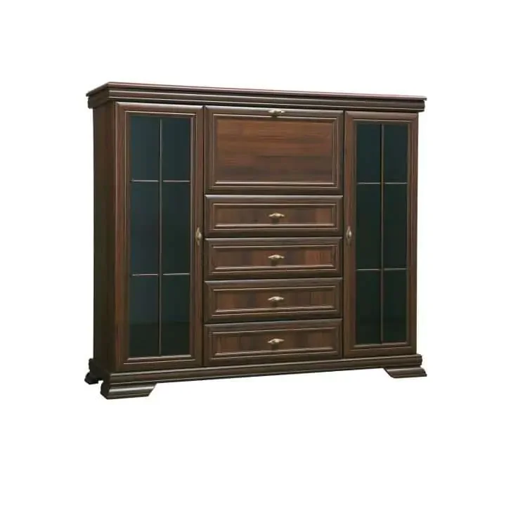 Vyšší komoda se skleněnými vitrínami po obou stranách, čtyřmi zásuvkami a barovou skříňkou s výklopnými dvířky nabízí praktické i elegantní úložné řešení pro obývací pokoj, jídelnu, ložnici či pracoviště.