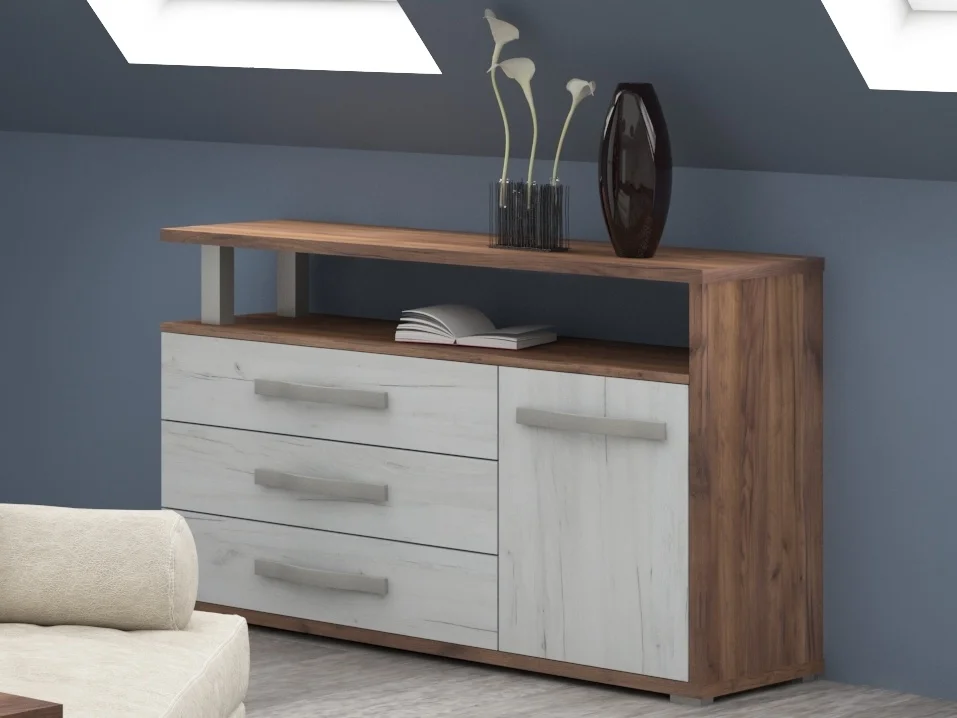 Moderní komoda s třemi zásuvkami a dvířky nabízí praktický úložný prostor a čistý vzhled. Kombinace barev craft tobaco a craft bílý působí nadčasově a lehce se sladí s různými styly interiéru.