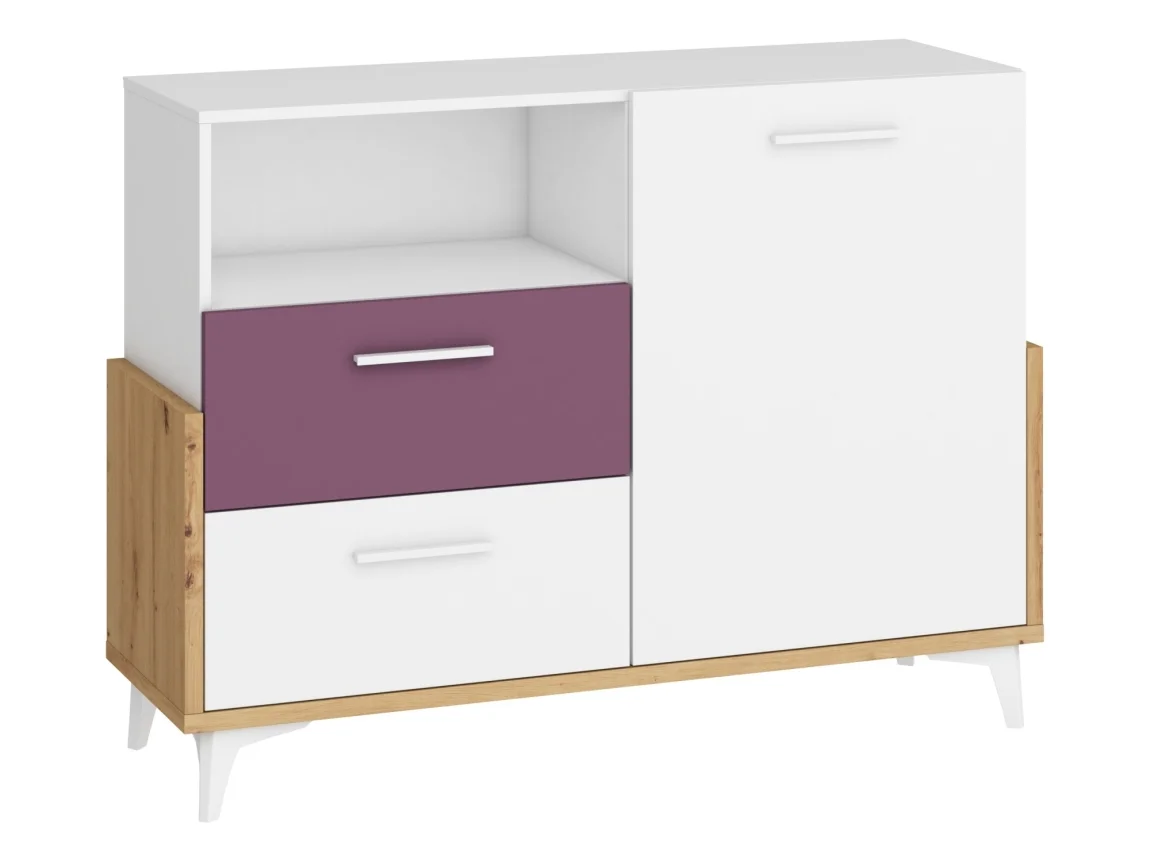 Elegantní komoda LEPON 125W nabízí stylové a praktické úložné místo: dvě samostatné zásuvky, otevřený policový prostor a skříňku s dvěma vnitřními poličkami. Její barevné pojetí kombinuje dub artisan s bílou a fialovou, nožky a úchytky jsou bílé, což vytváří svěží a moderní vzhled.