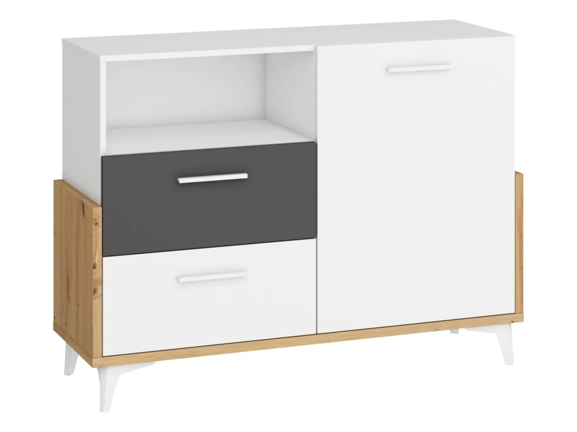 Komoda LEPON 125W spojuje moderní vzhled s praktickým uspořádáním pro každodenní využití. Barva kombinuje dub artisan spolu s bílými nohami a grafitovými doplňky, díky čemuž se hodí do různých interiérů.