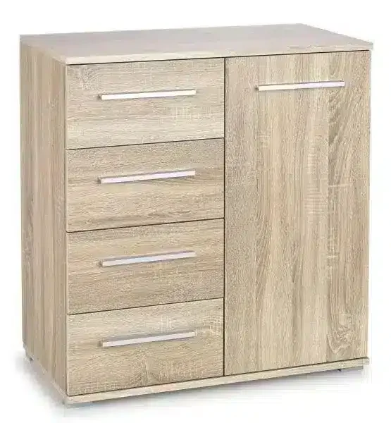 Komoda Lima KM-2 je vyhotovena z laminovaných a lakovaných dřevotřískových desek o tloušťce 16 mm, což zaručuje stabilní a odolnou konstrukci. Obsahuje čtyři zásuvky a jednodveřovou skříňku s jednou policí pro praktické uložení věcí.