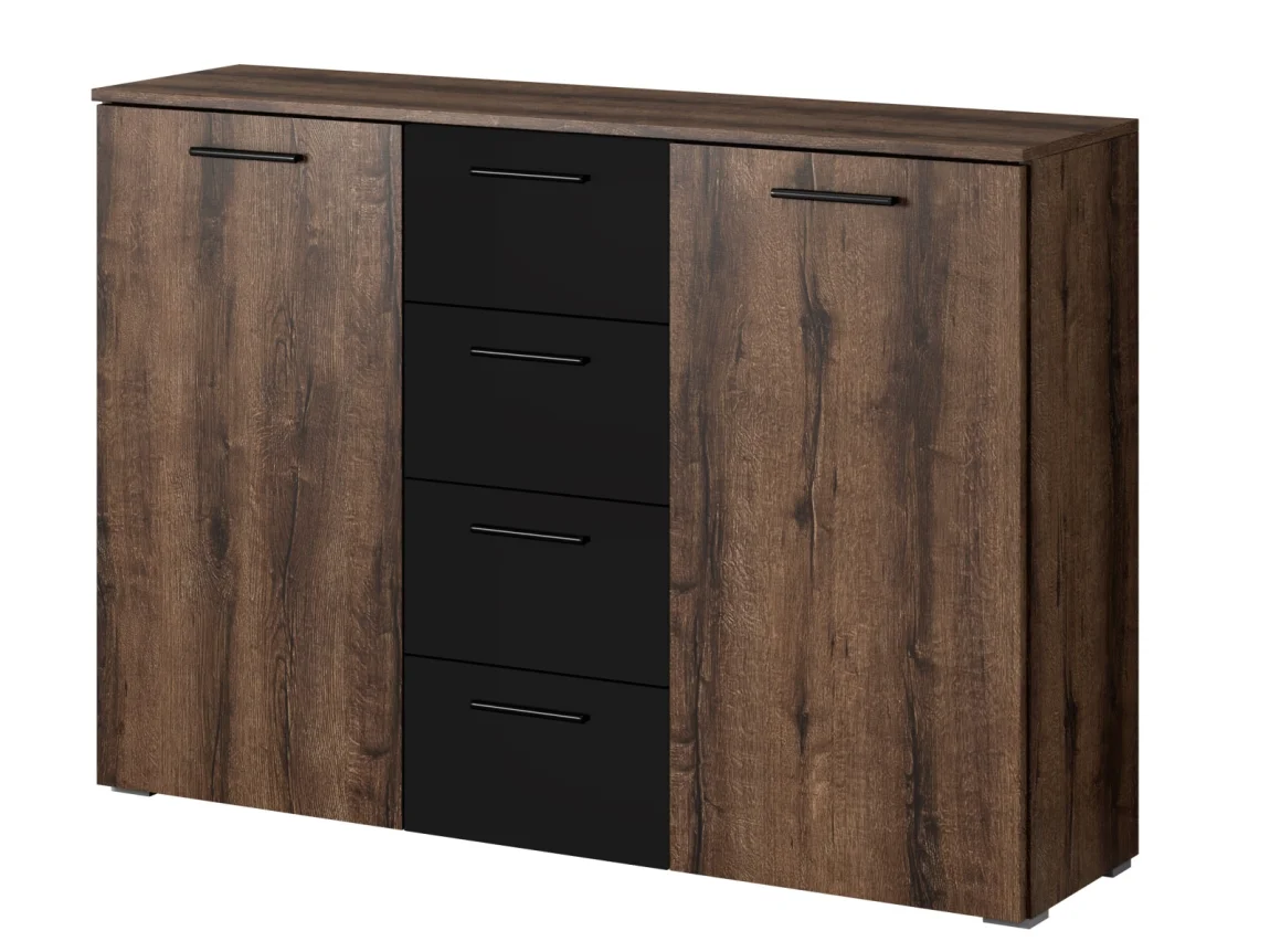 Stylová komoda MAGGIE 2D4S v kombinaci dub monastery a černé barvy přináší do ložnice i obývacího prostoru rovnováhu mezi vzhledem a úložnou praktičností. Její rozměry 132 cm na šířku, 38 cm hloubky a 93 cm výšky poskytují dostatek místa pro organizaci věcí.