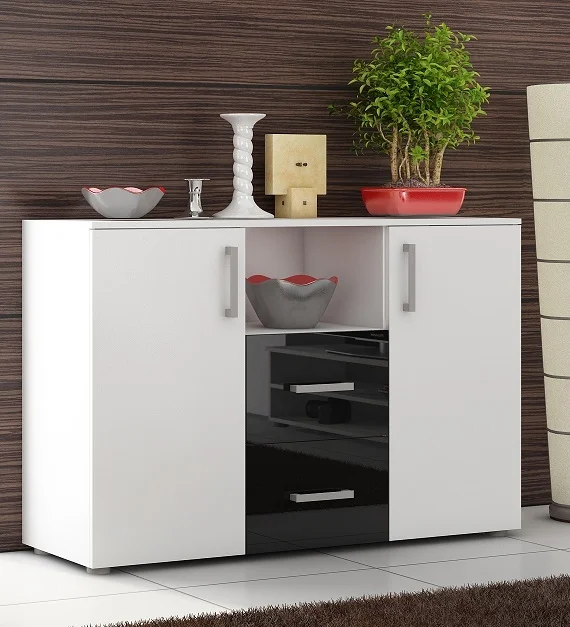 Komoda Mangona v provedení bílo-černý lesk přináší moderní vzhled a praktické úložné řešení do obýváku či ložnice. Je vyrobena z lamina o tloušťce 16 mm, což zaručuje pevnost a snadnou údržbu.
