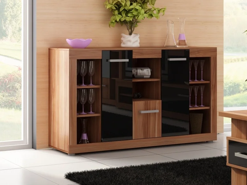 Velká komoda MOLTENO 3D v kombinaci švestka wallis a černý lesk představuje stylové a praktické řešení pro váš domov. Je vyrobená z lamina o tloušťce 16 mm, což zajišťuje pevnost a dlouhou životnost povrchu.