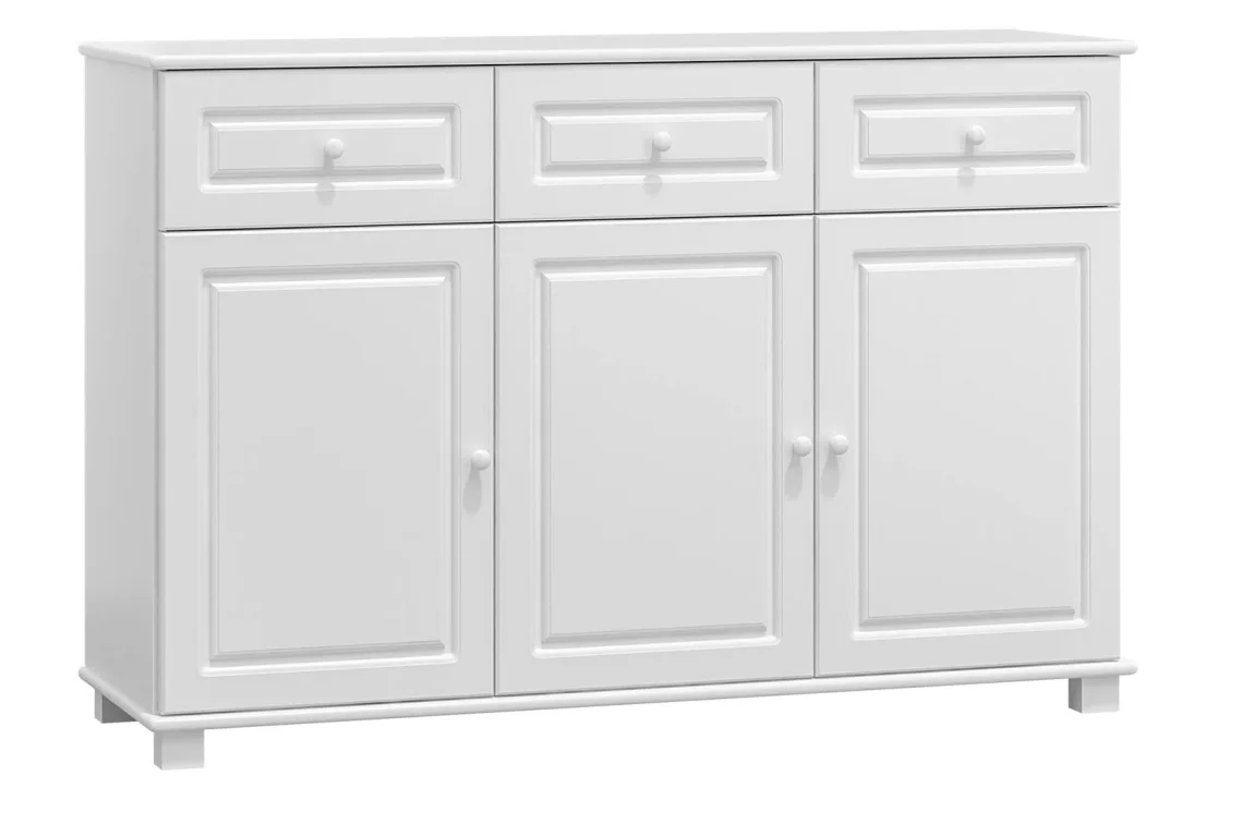 Kombinovaná komoda s třemi dvířky a třemi šuplíky je vyrobena z masivu borovice a poskytuje spolehlivý úložný prostor. Povrch má bílé moření, které dodává svěží a nadčasový vzhled.