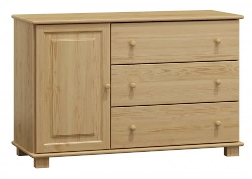 Praktická komoda vyrobená z masiv borovice kombinuje dvířka se třemi zásuvkami pro účelné uskladnění věcí. Rozměry: 78 cm výšky, 118 cm šířky a 47 cm hloubky. Je dodávána v demontovaném stavu, což usnadní a zrychlí montáž.