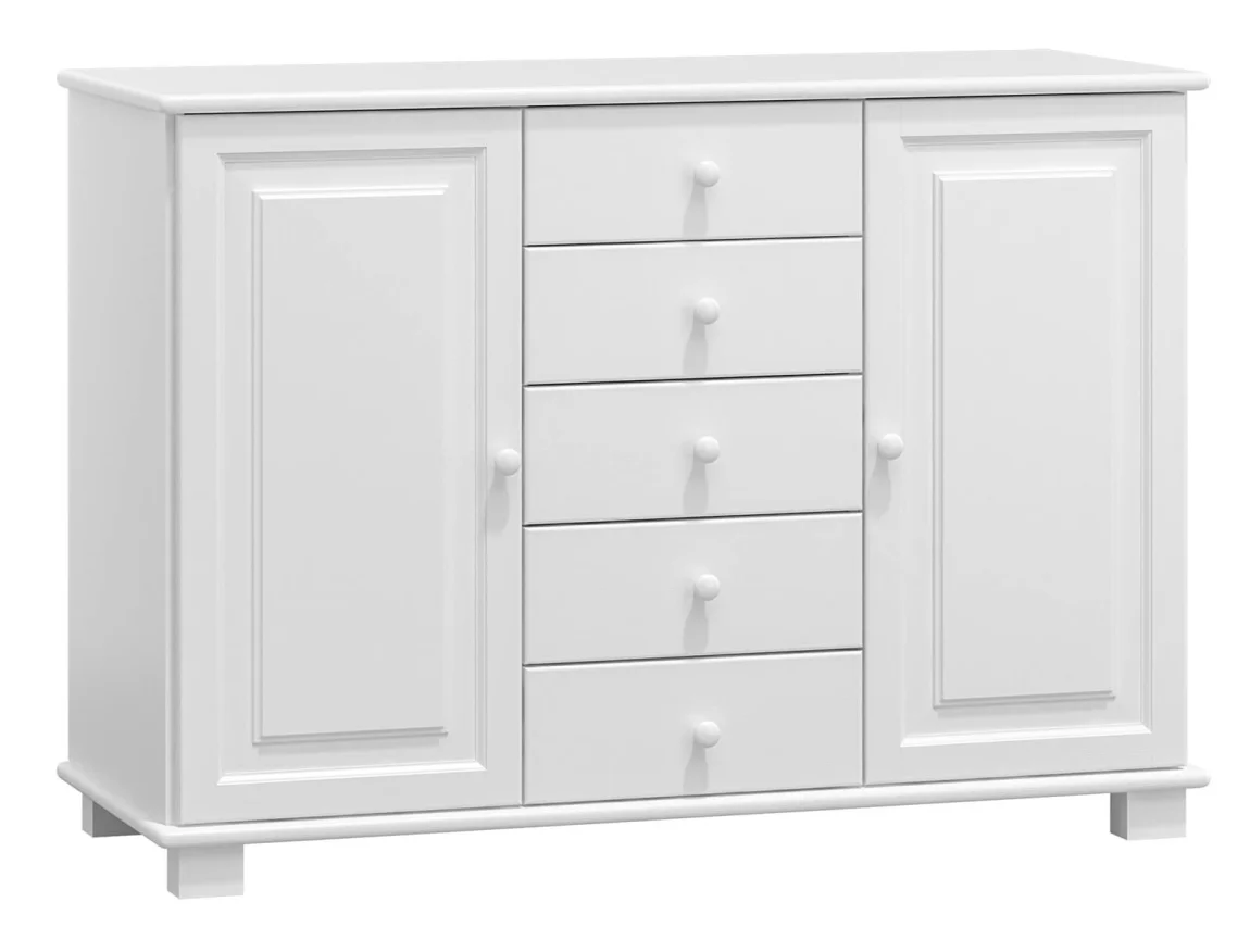 Elegantní kombinovaná komoda NEFTYS 37 z masivu borovice nabízí pět zásuvek a dvě dvířka pro jasně organizované úložné prostory. Bílé moření dodává svěží a nadčasový vzhled, který se skvěle hodí do ložnice i obývacího prostoru.