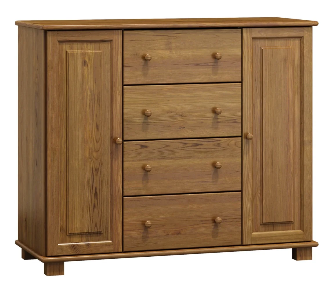 Kompaktní komoda s dvěma dvířky a čtyřmi zásuvkami nabízí praktické úložné místo pro váš prostor. Materiál tvoří masivní borovice a povrch je upraven do odstínu dubu, který dodává nábytku nadčasový vzhled.