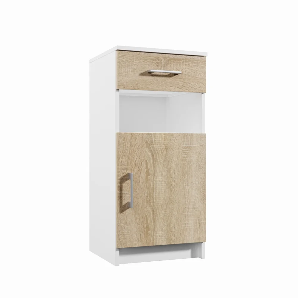 Kompaktní komoda NEJBY MARIANA kombinuje bílý korpus s dvířky v odstínu dub sonoma a nabízí praktický úložný systém. Rozměry jsou 40 cm na šířku, 87 cm na výšku a 38 cm do hloubky, takže se hodí i do menších prostor.
