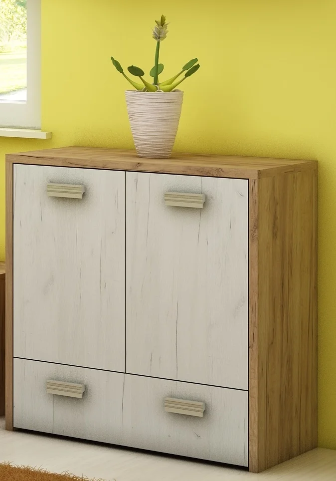 Komoda NELLORE v kombinaci odstínů craft zlatý a craft bílý spojuje moderní design s pevnou konstrukcí. Korpus je vyroben z lamina o tloušťce 25 mm, dvířka z lamina 16 mm a hranu tvoří ABS 0,6 mm, což zajišťuje dlouhou životnost a snadnou údržbu.