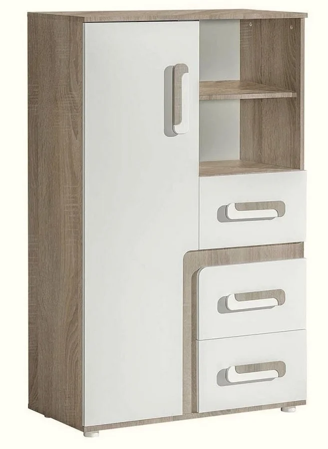 Komoda ORAKI 1D3S II v provedení dub jasný/bílá nabízí stylový vzhled a praktické úložné řešení pro mladší generaci i pro celou domácnost. Korpus je vyroben z kvalitní LTD desky, která je díky ABS hraně odolná vůči opotřebení.