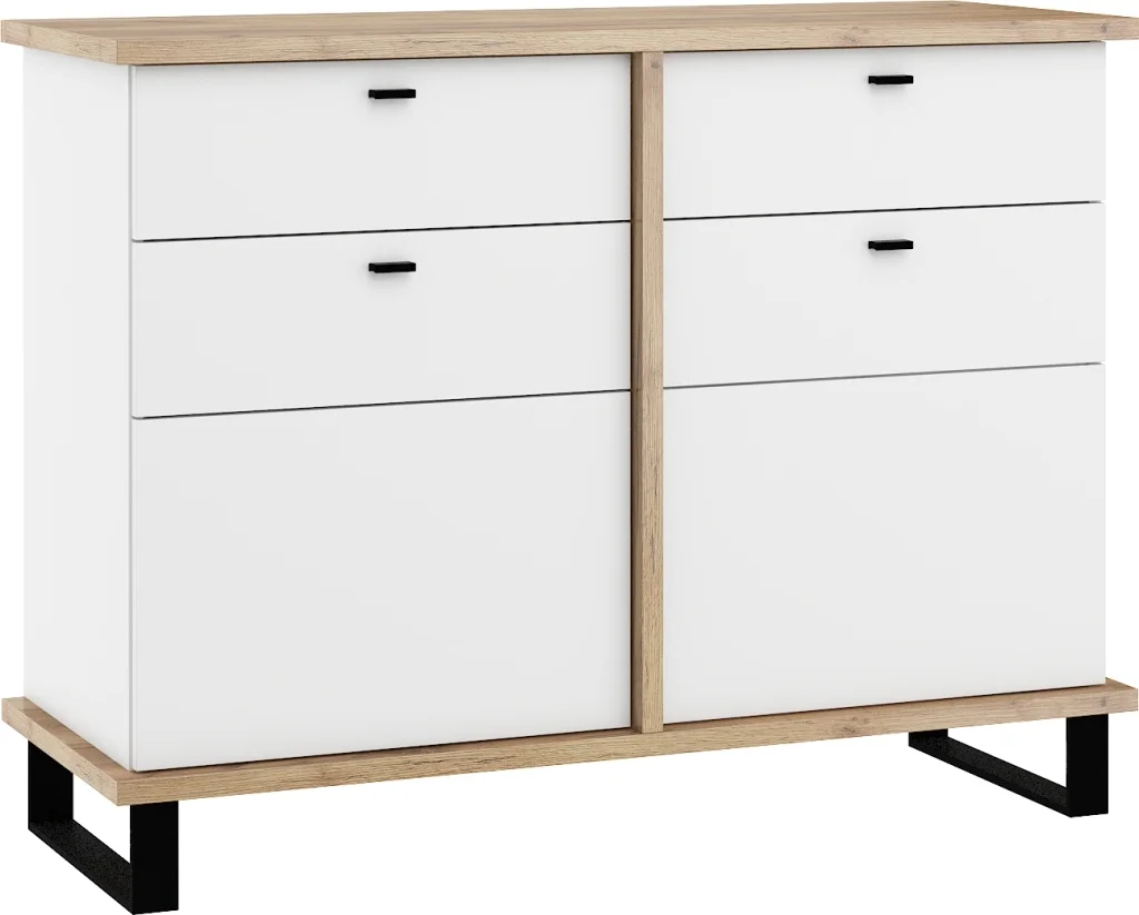 Systém tichého dovírání dveří zajišťuje hladké a tiché používání. Rozměry: šířka 120 cm, výška 91 cm a hloubka 45 cm. Povrch tvoří laminovaná deska tloušťky 16 a 25 mm s ABS hranami; nožky z černého kovu měří 12 cm a dotvářejí pevnou stabilitu. Úchyty jsou černé a dodávka probíhá v demontu. Tento kousek oživí každý moderní pokoj díky kontrastu světlého dřeva a bílé, a díky promyšlenému uspořádání nabídne dostatek úložného prostoru pro rodinu či domácí kancelář.