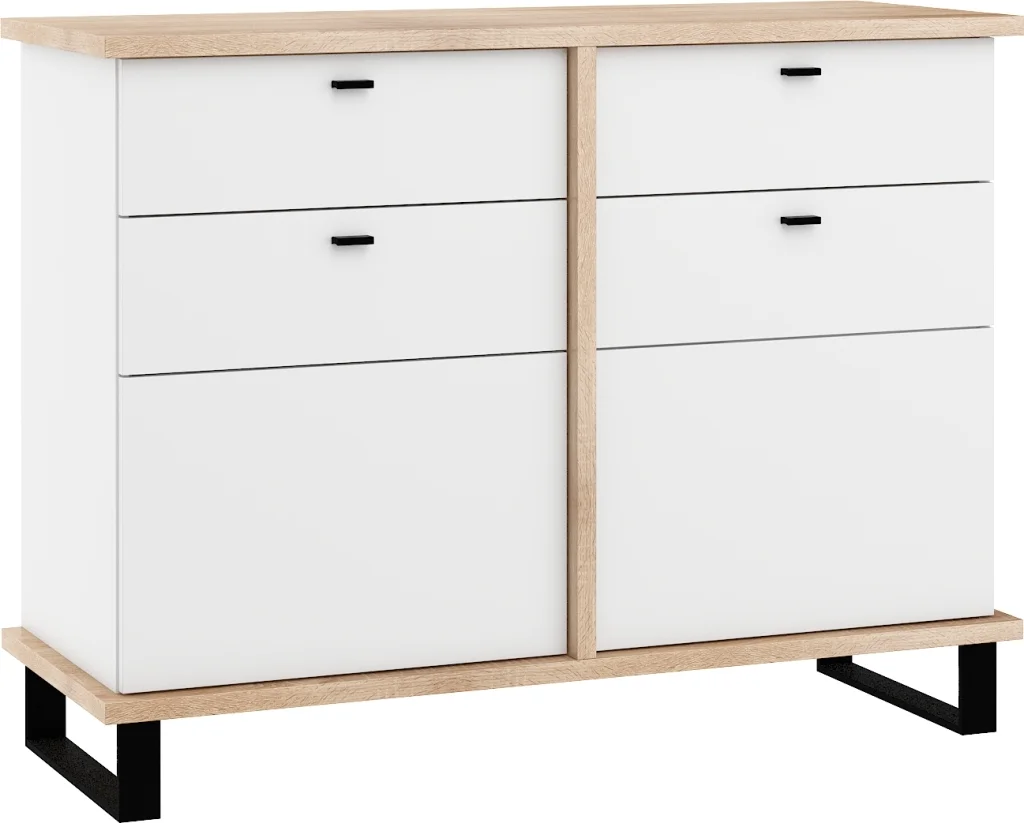 Komoda ORSOLA 2D2S kombinuje dvě skříňky s plnými dvířky a vnitřní policí spolu se dvěma zásuvkami. Systém tichého dovírání zajišťuje jemné a tiché zavírání dveří i zásuvek. Rozměry 120 x 91 x 45 cm a barevné provedení dub sonoma/bílá umožňují snadnou integraci do moderních interiérů. Desky o tloušťkách 16 a 25 mm jsou vybaveny ABS hranami, nožky z černého kovu o výšce 12 cm dodávají stabilitu a nadčasový vzhled. Dodání v demontu usnadní montáž u vás doma.