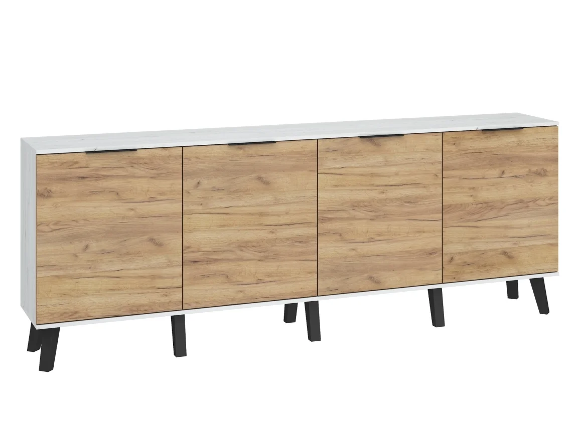 Komoda OSMAK 4D se čtyřmi dvířky nabízí stylové řešení pro váš byt v kombinaci craft bílé a craft zlaté. Její nadčasový vzhled doplňuje praktické vnitřní rozdělení a dostatek úložného prostoru.