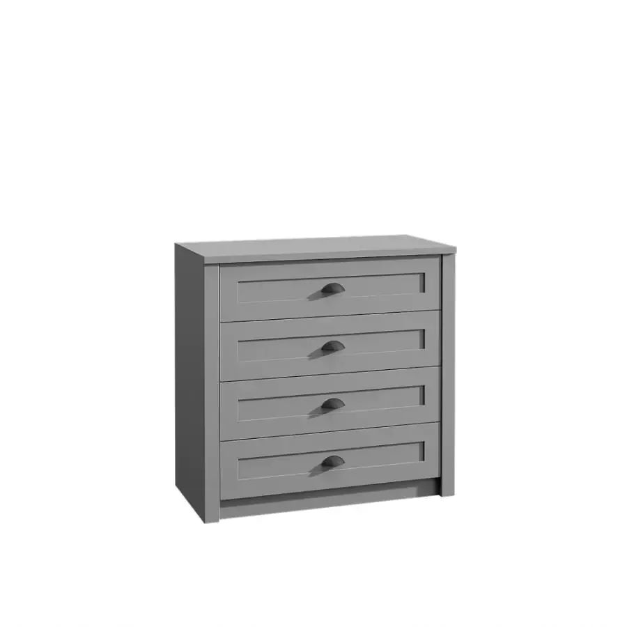 Komoda PROVANCE K4 v provensálském stylu je vyrobena z laminované dřevotřískové desky v šedém odstínu. Disponuje čtyřmi šuplíky s kovovými úchytkami, které poskytují dostatek prostoru pro drobnosti i větší předměty. Navržena je pro obývací pokoj, jídelnu, ložnici i předsíň, a díky svému univerzálnímu designu se hodí do různých interiérů. Dodávána je v demontovaném stavu, takže instalace je rychlá a jednoduchá. Tato komoda kombinuje styl s praktičností a bude skvělým doplněním vašeho interiéru.