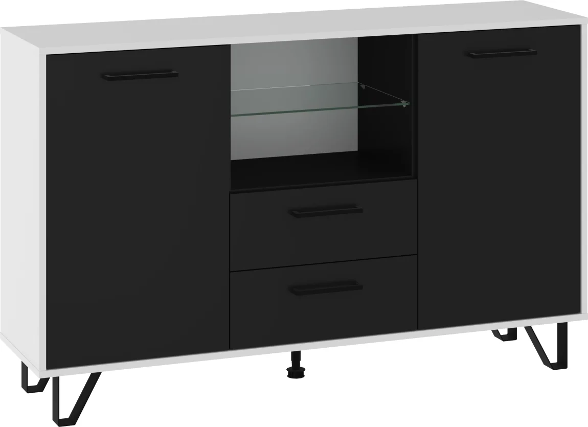 Praktická komoda Prudhoe 2D2S v provedení bílo‑černý lesk kombinuje moderní design s praktickými úložnými prostory. Rozměry 140 cm na šířku, výška 87 cm a hloubka 39 cm doplňují černé kovové nožky vysoké 12 cm a černé úchyty.