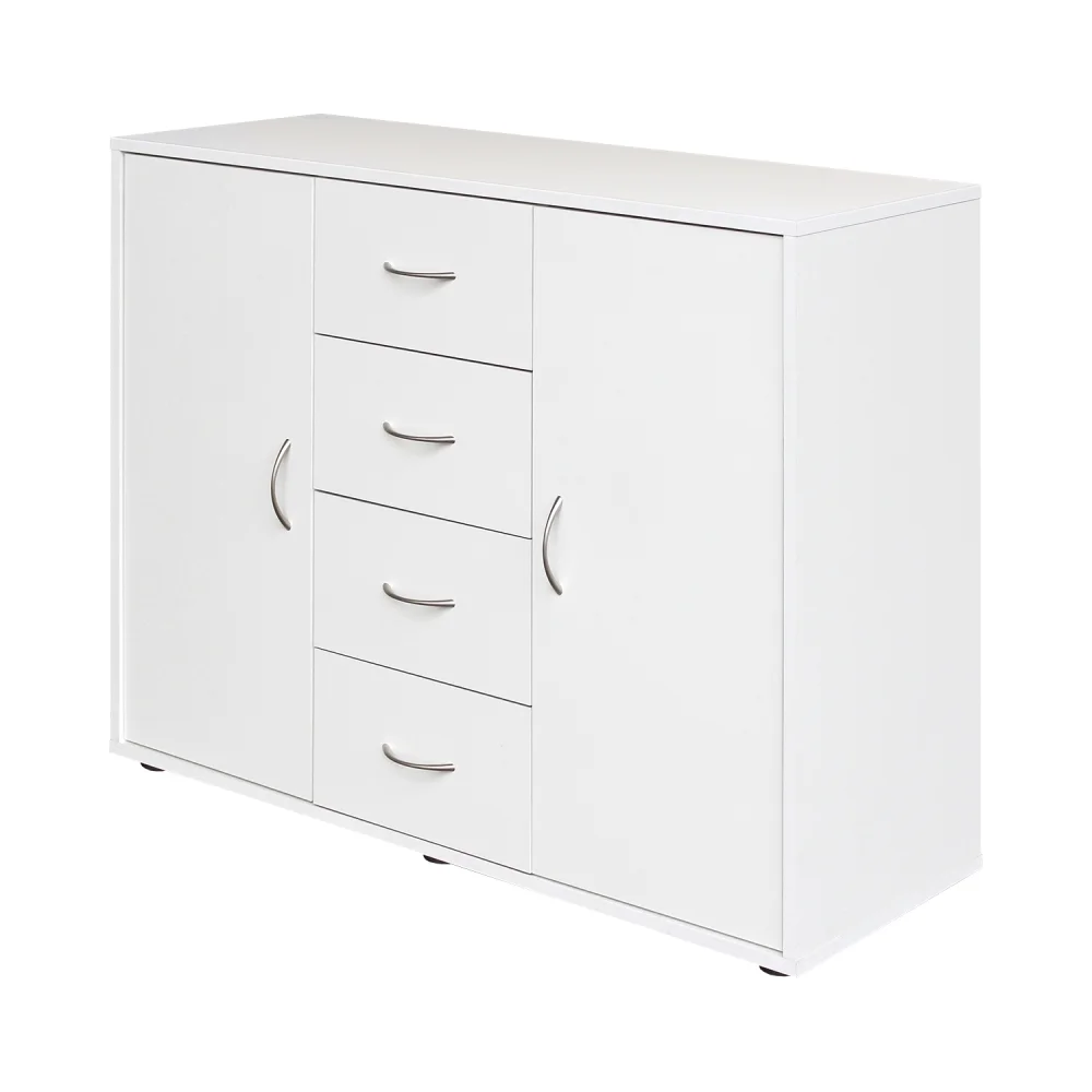 Praktická komoda RAIRESH v čistě bílé barvě přináší efektivní úložný prostor a moderní vzhled do každé místnosti. Její dvoudveřová konstrukce ukrývá čtyři zásuvky, které uspořádají drobnosti, spodní sekce ponechávají volný prostor pro větší předměty.