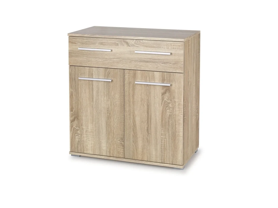 Základ tvoří laminovaná dřevotříska s ABS hranami, které odolávají každodennímu používání a snadno se čistí. Vnitřní prostor má 1 polici, která umožňuje lepší organizaci věcí. Dodání probíhá v demontu, což usnadňuje přepravu a rychlou montáž podle potřeby. Díky svému provedení a příjemnému odstínu dub sonoma je tato komoda vhodná do moderních i tradičních interiérů a nabízí praktické řešení pro ukládání oblečení či doplňků.