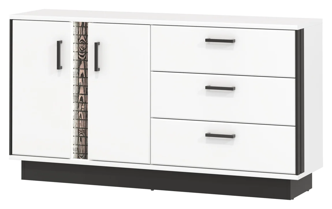 Moderní komoda SIGOURNEY 2D3S spojuje světlý korpus bílo‑černé kombinace s lesklými bílými dvířky, čímž vytváří elegantní a nadčasový vzhled. Rozměry 153 × 84 × 39,5 cm poskytují dostatek prostoru pro úschovu oblečení, doplňků i dokumentů.