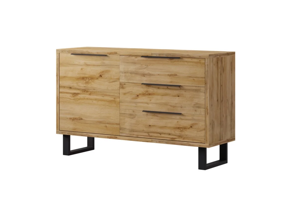 Praktická komoda SIGUNI v provedení dub wotan kombinuje moderní styl s praktickými rozměry. Rozměry 144 × 45 × 83 cm poskytují dostatek prostoru pro ukládání věcí. Vyznačuje se kombinací lamina a černého kovu, která dodá interiéru současný vzhled a dlouhou životnost.
