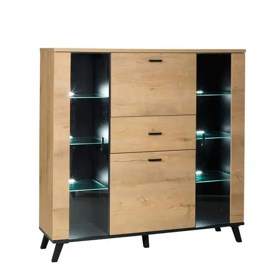 Po stranách najdete skleněné vitríny, které umožní stylovou prezentaci vašich dekorací. Spodní prostor je ve výšce 12 cm od podlahy, což usnadňuje přístup a lepší organizaci. Plastové nožičky zajišťují stabilitu a ochranu podlahy. Bez vestavěného LED osvětlení. Dodáváno v demontu.