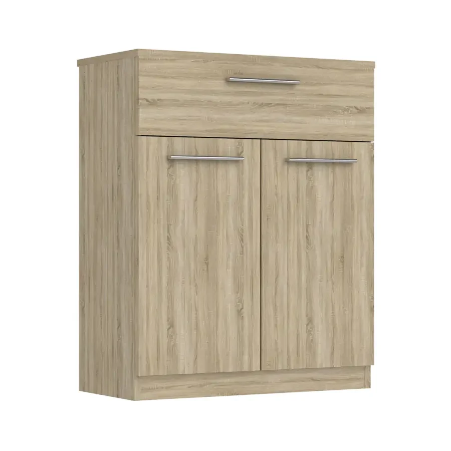 Komoda Surrey nabízí praktický úložný prostor skrytý za dvěma dveřmi a doplněný o jednu zásuvku s pevným kovovým pojezdem. Díky kovovým pojezdům je zásuvka lehká na vytahování a tiší chod při používání. Povrch v provedení dub sonoma působí teplým a nadčasovým dojmem. Tento kousek je ideální pro uložení oblečení, dokumentů i drobných doplňků a pomáhá udržet pořádek v každé místnosti. Neopomenutelnou výhodou je kompatibilita s dalšími kousky řady Surrey, což vám umožní snadno sladit styl celého interiéru. Dodává se v demontu.