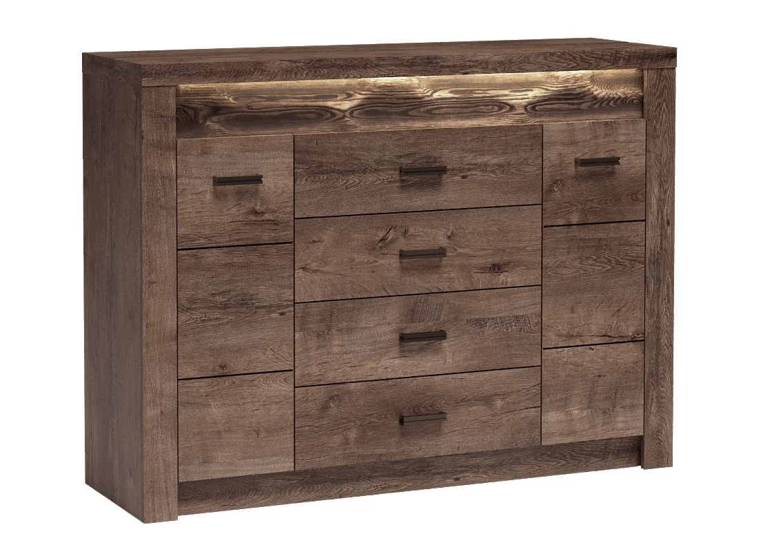 Elegantní komoda ze sektorové řady SWED S17 v odstínu jasan tmavý kombinuje praktický úložný prostor s nadčasovým designem. Po levé straně naleznete 4 zásuvky, zatímco za dvířky na pravé straně se ukrývají dvě police pro lepší organizaci věcí.