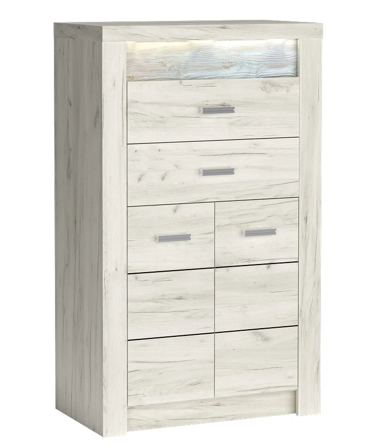 Vnitřek tvoří dvě zásuvky a za dvířky se ukrývá police pro odložení drobných předmětů. Materiál je lamino s ABS hranou (0,5–0,8 mm); úchyty jsou kovové a barva je jasan bílý. Rozměry komody jsou 76 cm šířka, 127 cm výška a 42 cm hloubka. Do ozdobné rýhované lišty lze dokoupit LED osvětlení, které zvýrazní rustikální dojem masivního dřeva. Dodáváme v demontovaném stavu.