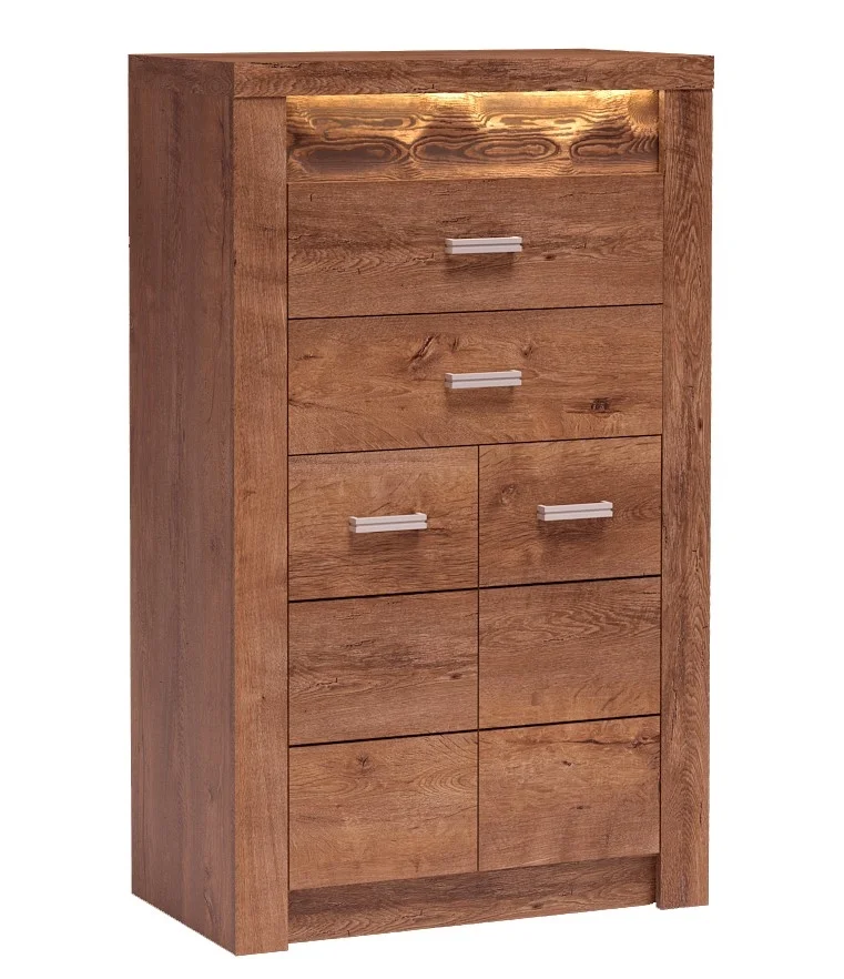 Materiál tvoří kvalitní lamino s ABS hranami o tloušťce 0,5–0,8 mm a kovové úchyty dodávají stabilitu i design. Rozměry: 76 × 127 × 42 cm. Do ozdobné rýhované lišty lze doplnit LED osvětlení, které lze dokoupit v naší nabídce a které podtrhne rustikální vzhled připomínající masivní dřevo. Dodáváme v demontovaném stavu.