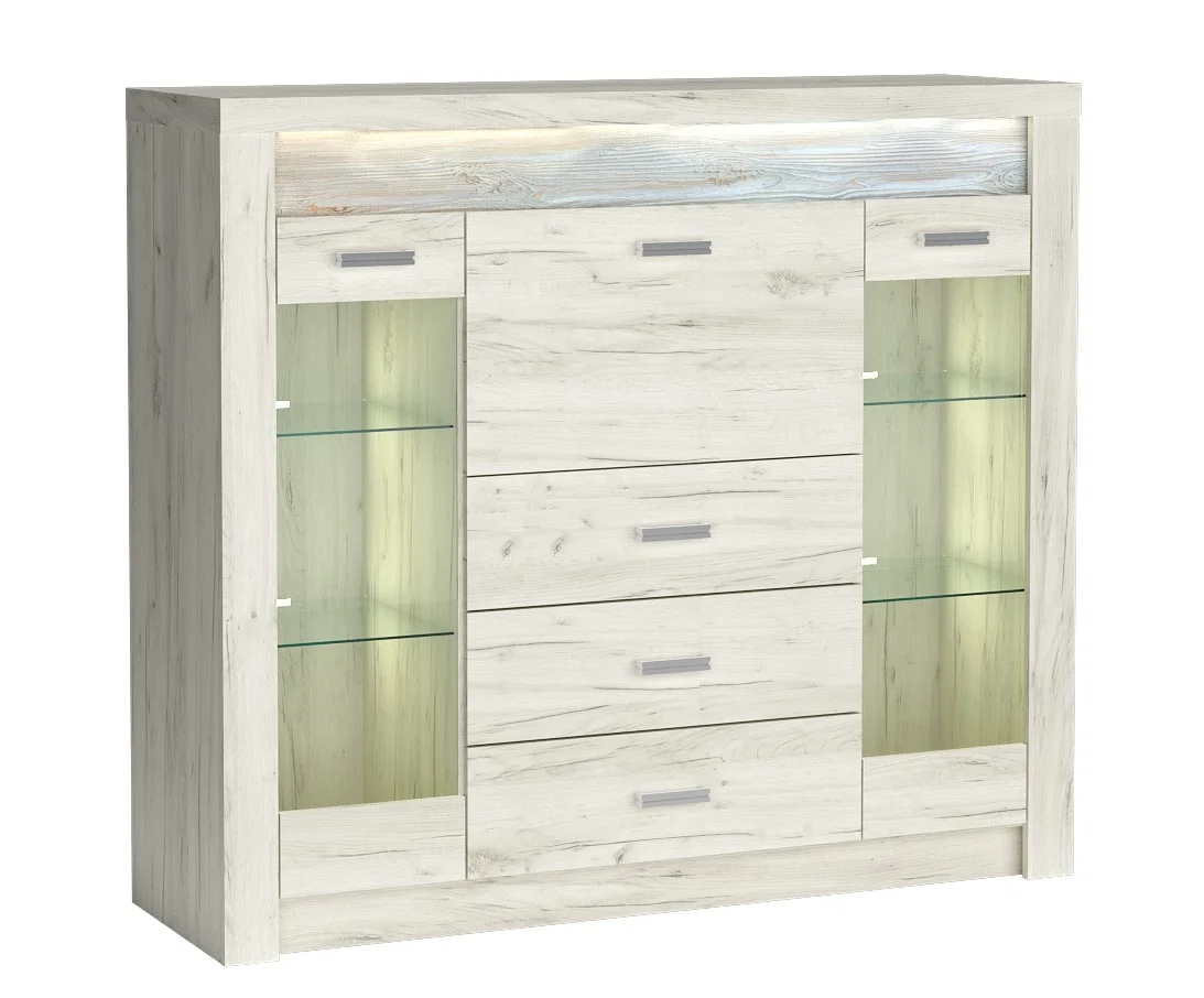Moderní komodový systém SWED S8 v provedení jasan bílý spojuje čisté linie s promyšleným uspořádáním pro efektivní využití prostoru. Sestava obsahuje 2 vitríny, 3 zásuvky a praktická výklopná dvířka, díky nimž budete mít uložené věci přehledně uspořádané. Rozměry 137 × 122 × 42 cm zajišťují vhodné řešení pro většinu obývacích pokojů; povrch tvoří kvalitní lamino s ABS hranami o tloušťce 0,5–0,8 mm a kovové úchyty dodávají stabilitu a styl. LED osvětlení vestavěné do ozdobné rýhované lišty podtrhuje rustikální dojem imitace masivního dřeva a vytvoří příjemné ambientní světlo. Dodáváme v demontovaném stavu; montáž je jednoduchá a zvládne ji i méně zruční. Díky modularitě této řady lze SWED S8 bez problémů rozšířit o další prvky, čímž snadno vytvoříte ucelený nábytkový systém na míru vaší místnosti.