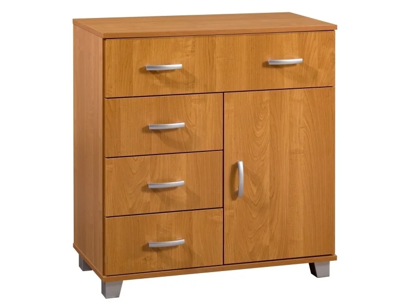 Komoda Tambala v odstínu olše spojuje pevnou konstrukci s praktickým úložným prostorem. Je vyrobena z laminátu LTD o tloušťce 16 mm, který zaručuje odolnost a snadnou údržbu, doplněná tvrzenými PVC úchytkami a kovovými pojezdy pro hladké zasouvání zásuvek.