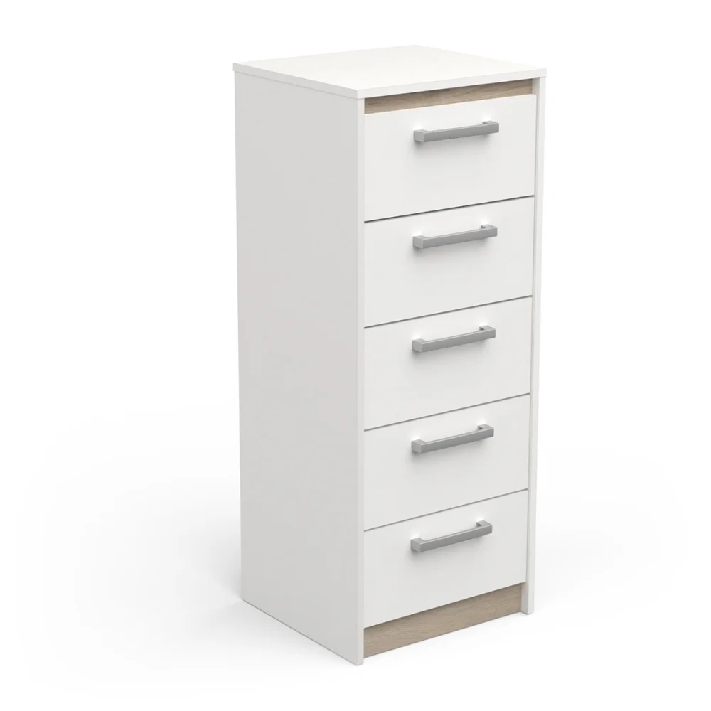Komoda TODY 5S úzká v kombinaci bílé barvy a dekoru dub Kronberg představuje praktický úložný systém pro ložnici i chodbu. Je vyrobena z lamina s odolným povrchem a má šedé plastové úchyty, které dotvářejí moderní vzhled.