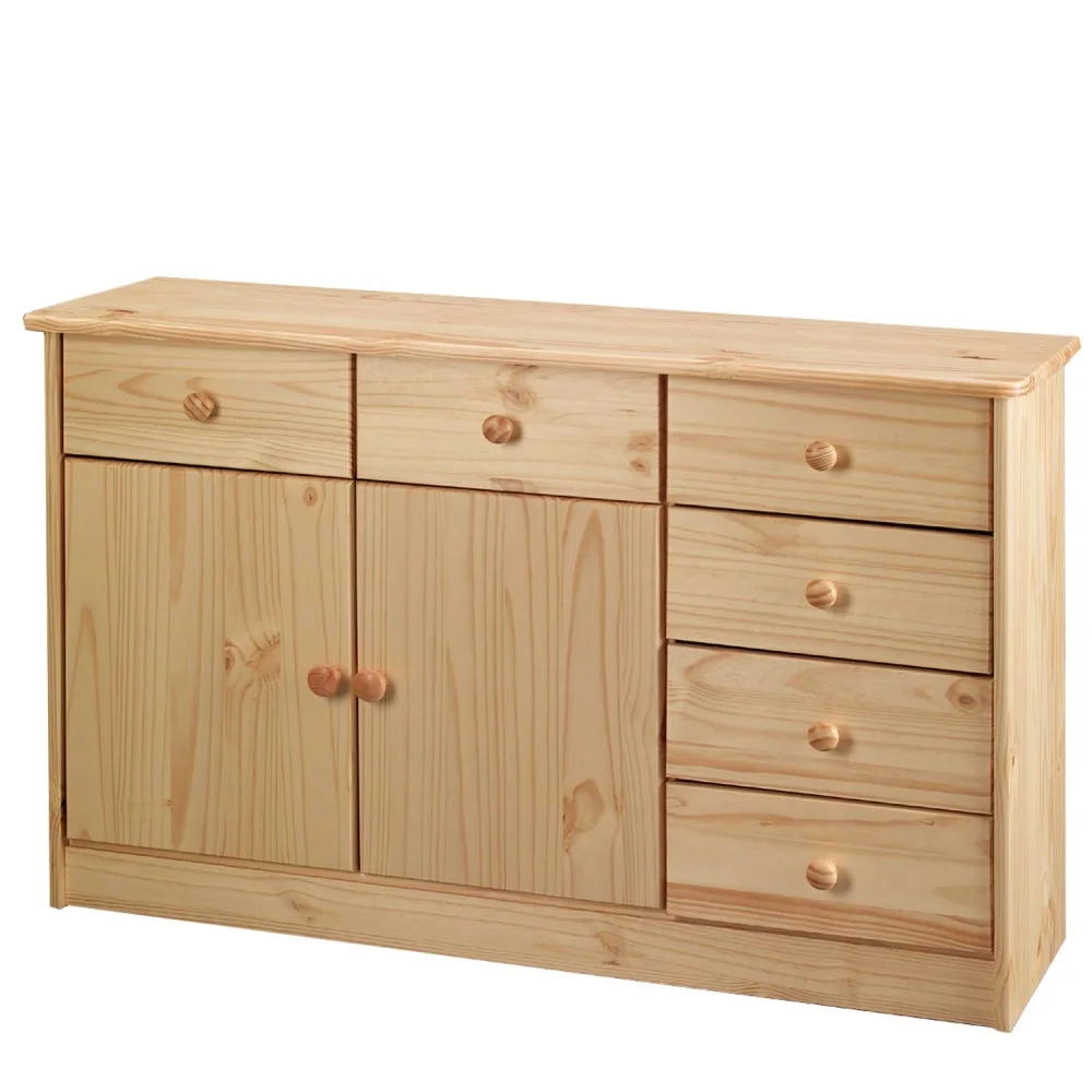 Povrch borovicového masivu je ošetřen bezbarvým lakem, takže vynikne kresba dřeviny a zároveň chrání nábytek proti opotřebení. Rozměry: šířka 118 cm, výška 75 cm, hloubka 35 cm; hloubka zásuvky 27,5 cm. Vnitřní členění zahrnuje 6 zásuvek, 2 dvířka a variabilní polici, dodávané v demontu. Kovové pojezdy v zásuvkách zajišťují tichý a plynulý chod. Záruka 24 měsíců. Je to robustní a dlouhodobě odolný kus nábytku, který se hodí do ložnice, pracovny i šatny a poskytuje dostatek prostoru bez kompromisů.