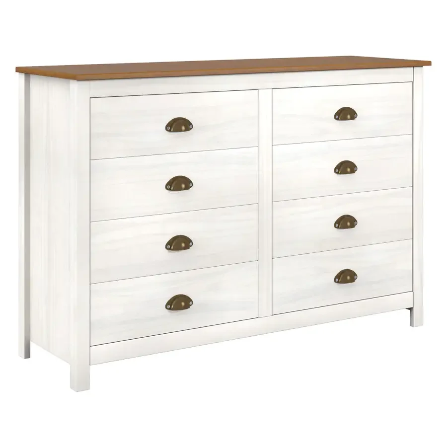 Praktická komoda TOPAZIO kombinuje stylový vzhled s bohatým úložným prostorem. Je vyrobena z masivního borovicového dřeva a povrchová úprava v bílé a hnědé barvě dodává kusu nadčasový vzhled.