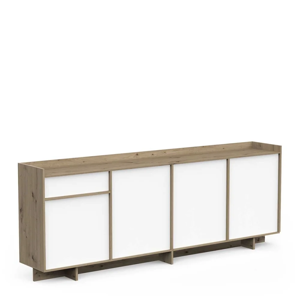 Komoda TORZEL 4D1S kombinuje dvířka a praktický šuplík pro přehledné ukládání. Rozměry jsou 209,3 x 35,9 x 82,3 cm, takže poskytují dostatek místa pro vaše věci. V provedení dub royal s bílými detaily působí elegantně a nadčasově.
