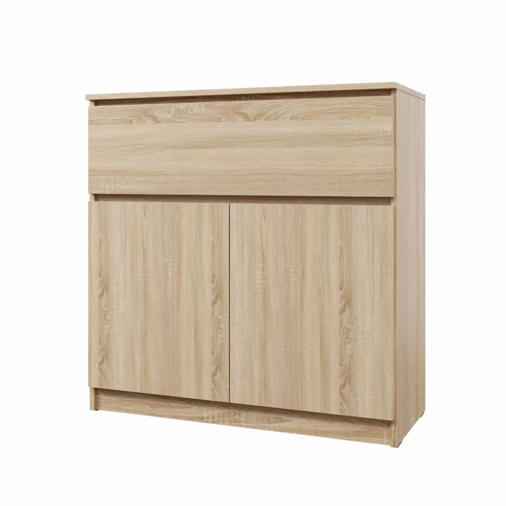 Komoda Turner v provedení dub sonoma přináší elegantní vzhled do vašeho interiéru. Rozměry: šířka 92 cm, výška 93,6 cm a hloubka 40 cm poskytují dostatek úložného prostoru bez zbytečného přeplnění místnosti. Vyrobeno z laminovaného materiálu LTD, který zaručuje pevnost a dlouhou životnost při snadné údržbě. Dodáváno v demontu, součástí jsou návod a spojovací materiály pro rychlou montáž. Tato komoda je skvělým doplňkem do obývacího pokoje i ložnice; její nadčasový design se hodí k mnoha stylům a usnadní uspořádání drobných věcí.