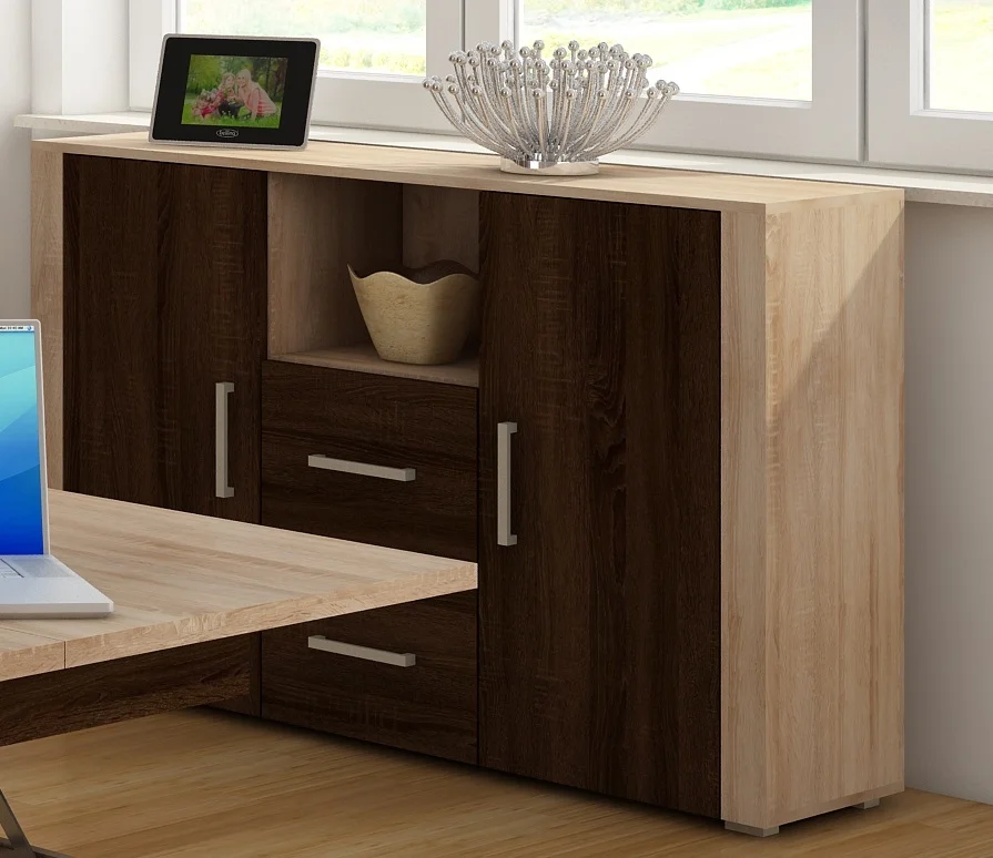 Velká komoda WUBIN 2D2S nabízí dvě zásuvky a dvě police pro pohodlné uspořádání věcí. Barva kombinuje korpus dub sonoma, dvířka dub sonoma tmavý a boční lišty dub sonoma pro moderní vzhled.