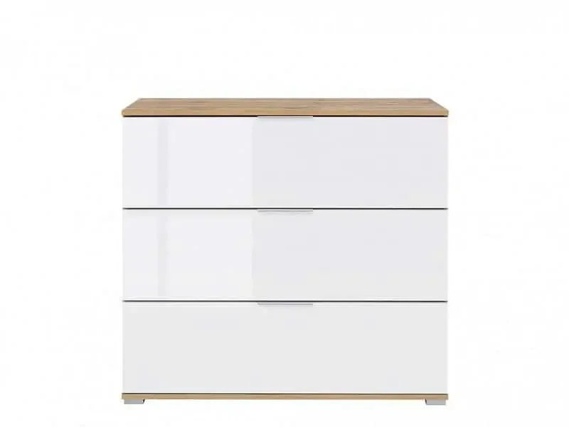 Stylová a praktická šuplíková komoda Zele KOM3S kombinuje dub wotan s lesklými bílými dvířky a čely, čímž dohromady vytváří svěží, nadčasový vzhled. Tři prostorné zásuvky poskytují dostatek místa pro oblečení i dokumenty, takže organizace věcí je jednoduchá.