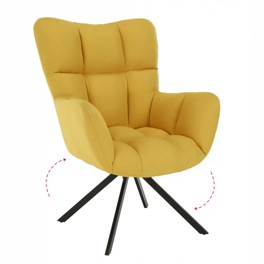 Nadčasové čalouněné otočné křeslo KOMODO ve žluto-černém provedení přináší do interiéru elegantní design. Pevné kovové nohy v černé barvě zajišťují stabilitu a dlouhou životnost.