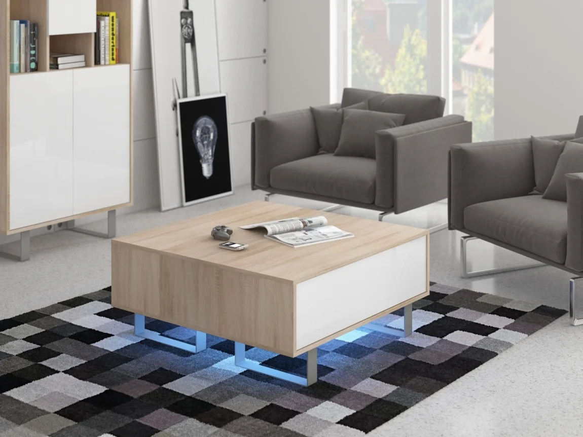 Moderní konferenční stolek BOKARO 8 v kombinaci dubu sonoma a bílého lesku vyniká nadčasovým designem a jednoduchou elegancí. Rozměry 85 x 45 x 85 cm a deska tloušťky 16 mm LTD zajišťují stabilitu a dlouhou životnost.