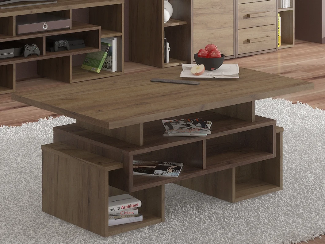 Konferenční stolek DORINDA, typ 2, v kombinaci dekoru craft tobaco a craft zlatý skvěle zapadne do moderních i tradičních interiérů. Rozměry 110 x 48 x 62 cm zajistí dostatek odkládacího prostoru pro časopisy, ovladače a notebooky.
