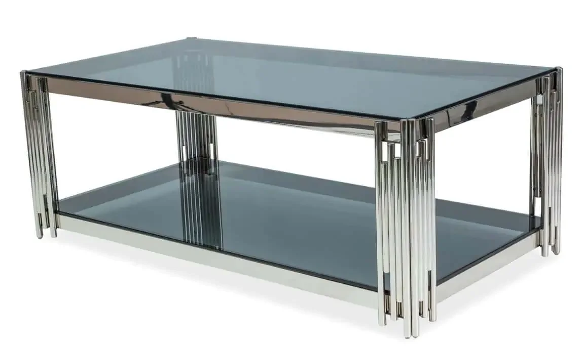 Konferenční stolek s výrazným glamour nádechem a moderním stylem se stane dominantním prvkem vašeho obývacího prostoru. Konstrukce je z kovu v barvě chrom a odkládací desky tvoří tvrzené kouřové sklo. Tento netradiční kousek skvěle zapadne do různých interiérů a dodá jim noblesu. Dodáváme v demontovaném stavu, což usnadňuje dopravu a montáž. Díky kombinaci kovu a skla působí vzdušně, ale zároveň je robustní a odolný vůči každodennímu použití.