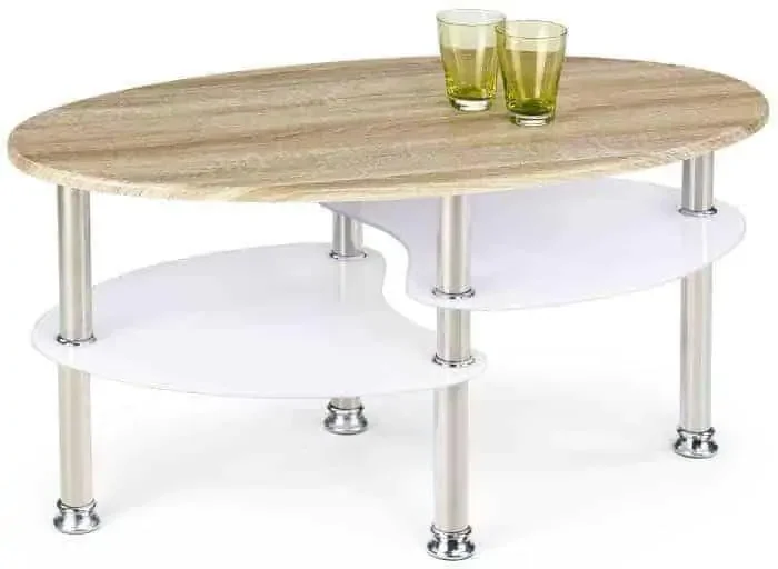 Moderní oválný konferenční stolek Medea spojuje odolný MDF, nerezovou ocel a sklo pro čistý, nadčasový vzhled. Deska stolu je laminovaná MDF s dekorem dub Sonoma. Dvě praktické odkládací police ze skla v bílé barvě doplňují prostor pro drobnosti a zvyšují praktičnost. Nohy stolku jsou vyrobeny z nerezové oceli, což zajišťuje stabilitu a dlouhou životnost. Tento kousek dodá interiéru moderní vzhled a skvěle se hodí do obývacího pokoje i dalších prostor. Zboží je dodáváno v demontu, což usnadňuje přepravu a montáž. Vyznačuje se nadčasovým designem, který se hodí k různým stylům interiéru a snadnou údržbou.