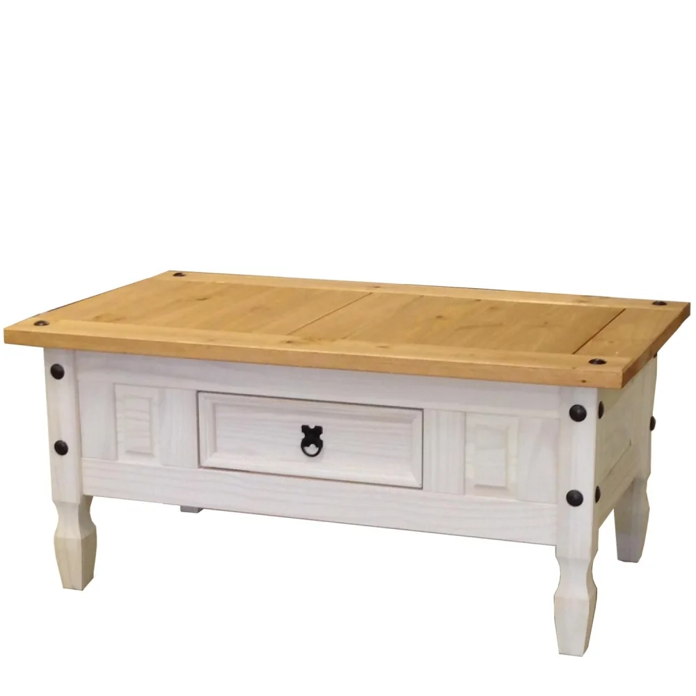 Stolek PIMBOW je vyroben z masivní borovice a ošetřen voskovou úpravou, která zdůrazňuje kresbu dřeva. Rozměry 100 x 45 x 60 cm (š x v x h) poskytují stabilní odkládací plochu i prostor pro drobnosti. Horní deska je voskovaná v medovém odstínu, zatímco boční části a rám mají bílo‑voskovaný vzhled, čímž vzniká jemný kontrast. Do prostoru se vejde jedna zásuvka s kovovými dekorativními úchyty pro schování drobných předmětů. Stolek dodáváme v demontu a součástí balení je kartonový obal pro snadnou dopravu. Díky kombinaci přírodního materiálu a jemných úprav působí nadčasově a hodí se do moderních i tradičních interiérů.