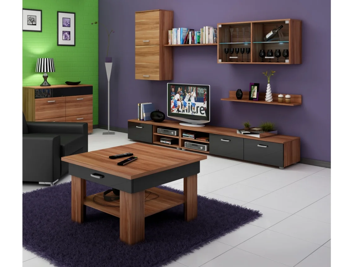 Konferenční stolek SANGOLE v kombinaci švestka wallis a černý lesk nabízí dvě praktické zásuvky a prostornou polici. Rozměry 80 x 52 x 80 cm zajišťují komfort a stabilitu při každodenním používání.